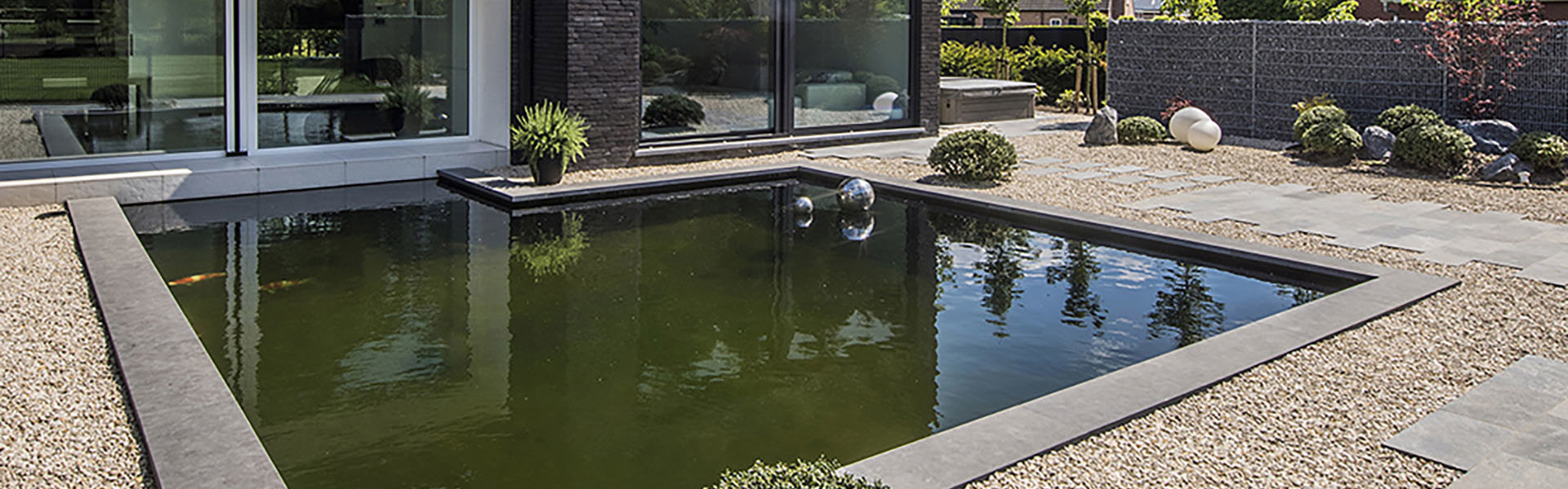 Functionele Pond Technics foliedoorvoer met rooster die een volledig vlakke, verdoken plaatsing garandeert.